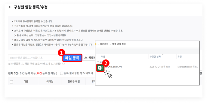 관리자 권한을 가지고 있는 사용자는 함께 협업할 구성원의 아이디(이메일 주소)를 엑셀 파일로 일괄 등록할 수 있으며, 같은 방법으로 구성원의 정보를 일괄로 수정할 수 있습니다. 이미 등록된 이메일 주소를 다시 업로드할 경우, 엑셀 파일에 있는 데이터로 정보가 업데이트됩니다.