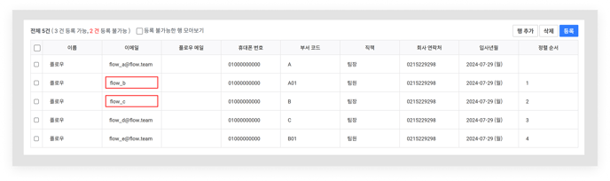 형식, 중복된 이메일 주소 등의 이유로 등록이 불가능한 행을 의미합니다. 수정 또는 삭제 후 계정 등록이 가능합니다.