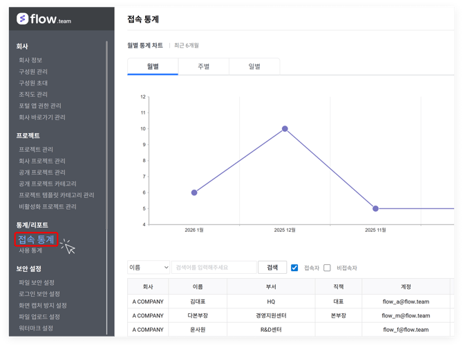 우리 회사 직원들의 접속량을 차트와 수치로 확인할 수 있습니다. 관리자 설정 페이지 내 '통계/리포트 항목 > 접속 통계'를 선택하여 월별/주별 접속량을 확인하는 것이 가능합니다.