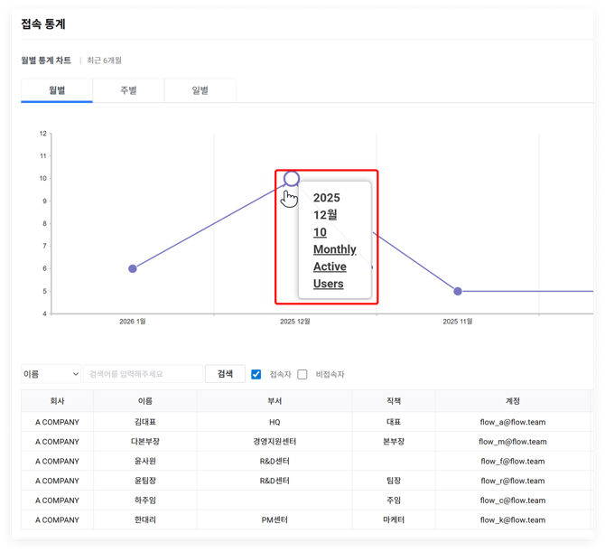 화면 상단에 있는 '월별' 영역을 누르면 최근 6개월 간 월별 접속량을 확인할 수 있고, '주별' 영역 선택 시 최근 10주 간의 주간 접속량을 확인할 수 있습니다. 그래프 꼭지점 항목에 마우스 커서를 올리면 정확한 데이터를 확인하는 것이 가능합니다.