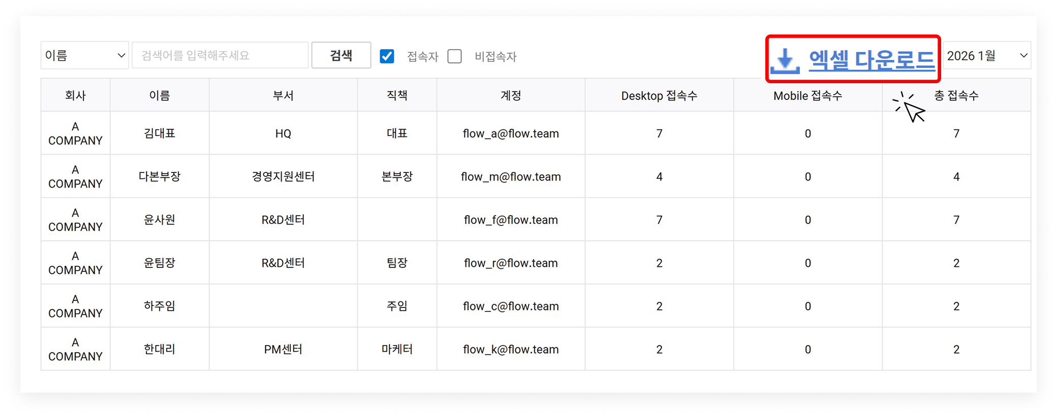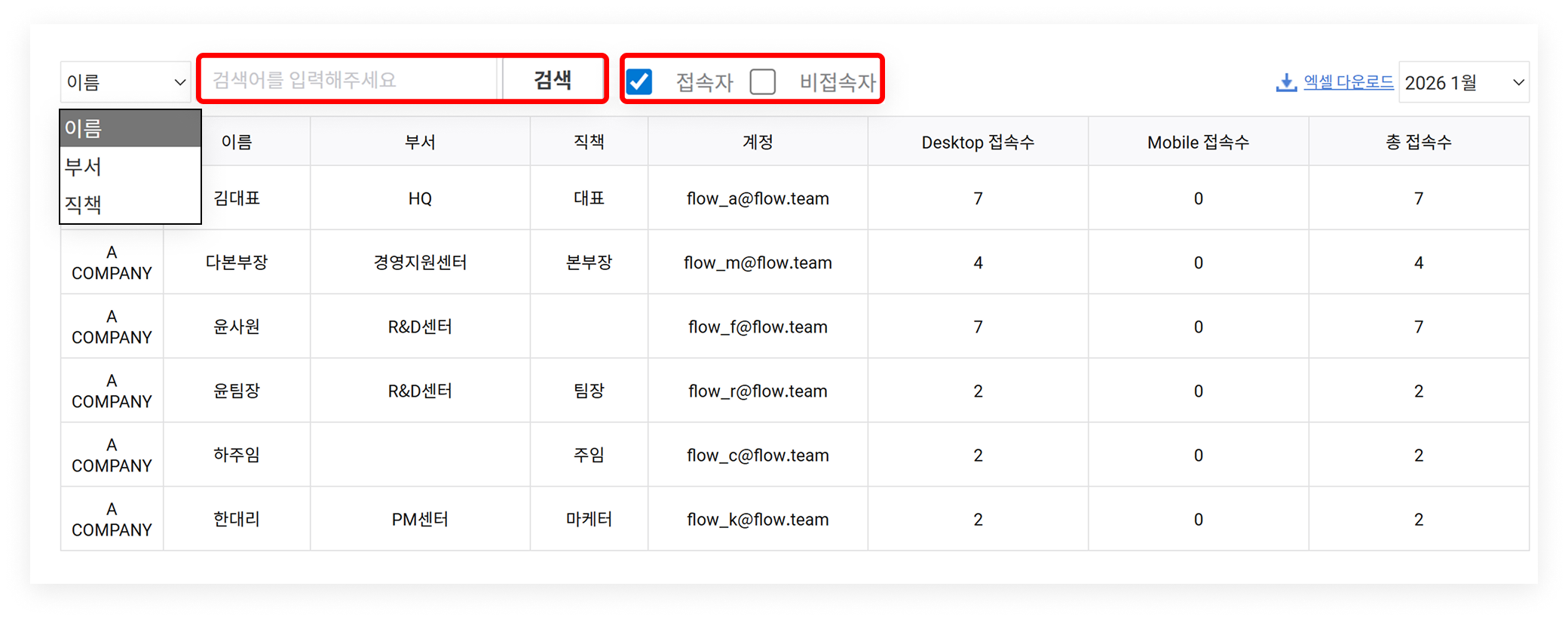 이름/부서/직책별로 접속 통계를 상세하게 확인할 수 있습니다. 검색창에 키워드 입력 후 '검색' 버튼을 누르면 '기기별 접속 수'와 '이번 주 접속 수'를 각각 확인할 수 있습니다.