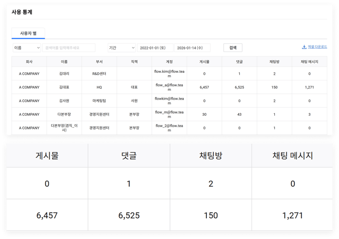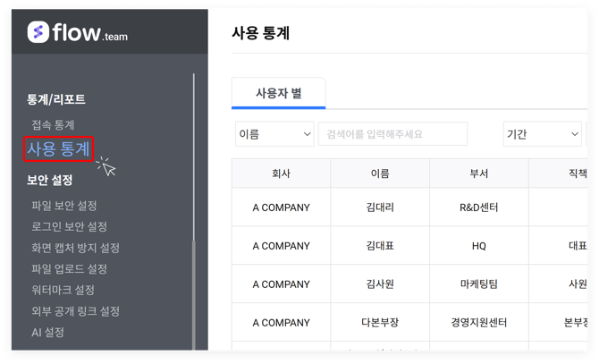 우리 회사 직원들의 기능별 사용량을 데이터로 확인할 수 있습니다. 어드민 페이지 내 '통계/리포트 항목 > 사용 통계' 메뉴에서 직원별 사용량을 한 눈에 확인하는 것이 가능합니다.