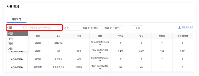 이름, 부서, 직책, 계정별로 확인하고 싶은 사용자만 모아서 사용량을 확인할 수 있습니다.