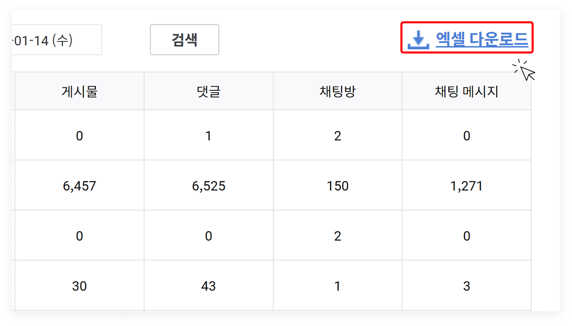 사용 통계는 '엑셀 다운로드' 기능을 통해 파일로 내려받을 수 있습니다. 원하는 키워드를 검색한 후 엑셀 내려받기를 선택하면 주제별로 내부 공유 및 보고에 활용할 수 있습니다.