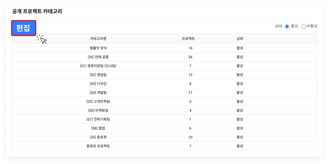어드민 화면에서 프로젝트 탭의 '공개 프로젝트 카테고리'를 누르면, 카테고리를 확인 및 설정할 수 있는 화면이 열립니다. 카테고리명은 물론, 카테고리별로 등록된 프로젝트 수와 활성 상태를 확인할 수 있습니다.