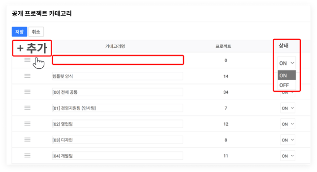 등록되어 있는 카테고리명을 변경하거나 활성 상태를 변경할 수 있습니다. 카테고리 항목의 좌측 부분을 마우스로 드래그하여 위-아래로 이동하면 공개 카테고리 카테고리 순서를 변경할 수 있고, '삭제'를 누르면 등록된 카테고리를 삭제할 수 있습니다.