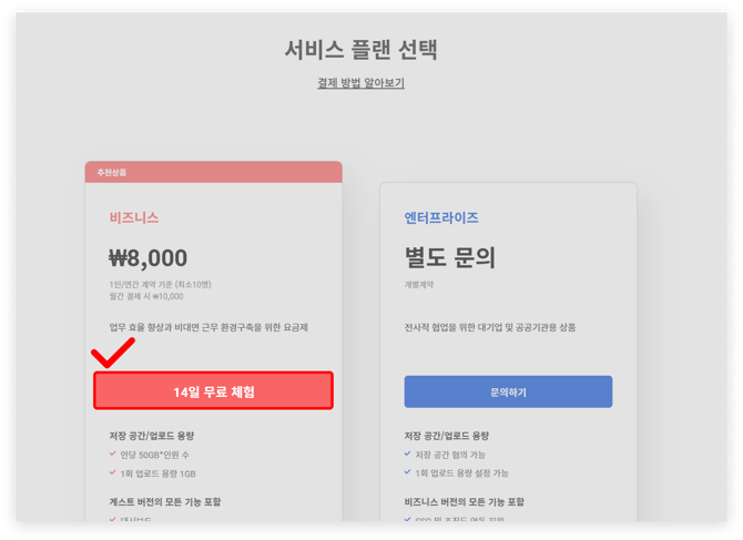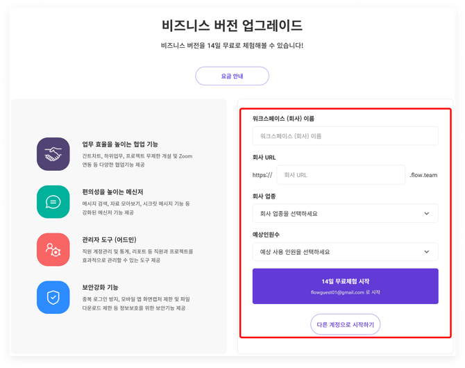 비즈니스 플랜 부분의 '14일 무료 체험' 버튼을 누르면, 이후 비즈니스 버전 업그레이드 화면이 표시됩니다.