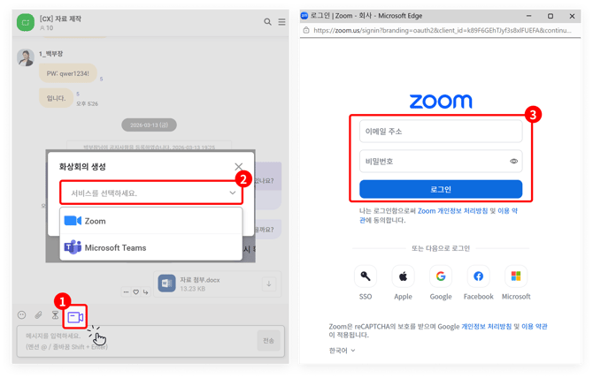 참여 중인 일반 채팅 또는 프로젝트 채팅에서 화상 회의를 바로 생성할 수 있습니다. 대화를 주고 받던 채팅방에 '줌 참여하기' 링크가 바로 생성되기 때문에 참여자들에게 별도로 화상 회의 링크를 전달하지 않아도 됩니다. 채팅방 내에서 아래 번호 순서대로 진행하면 됩니다.