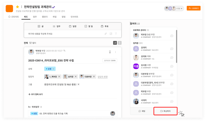 프로젝트 내에서 일정 게시물을 작성할 때 '화상 회의 추가' 옵션을 선택하면 추후 화상 회의를 바로 개설할 수 있습니다.
