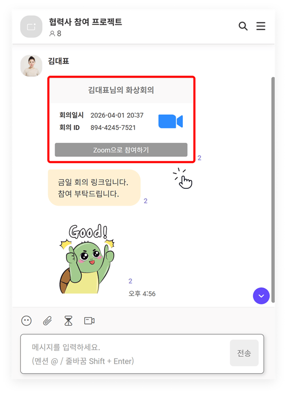 프로젝트에서 생성한 화상 회의 링크는 프로젝트 채팅방에 자동으로 업로드됩니다. 'Zoom/Microsofot Teams'으로 참여하기'를 선택하면 바로 화상 회의에 참여할 수 있습니다.