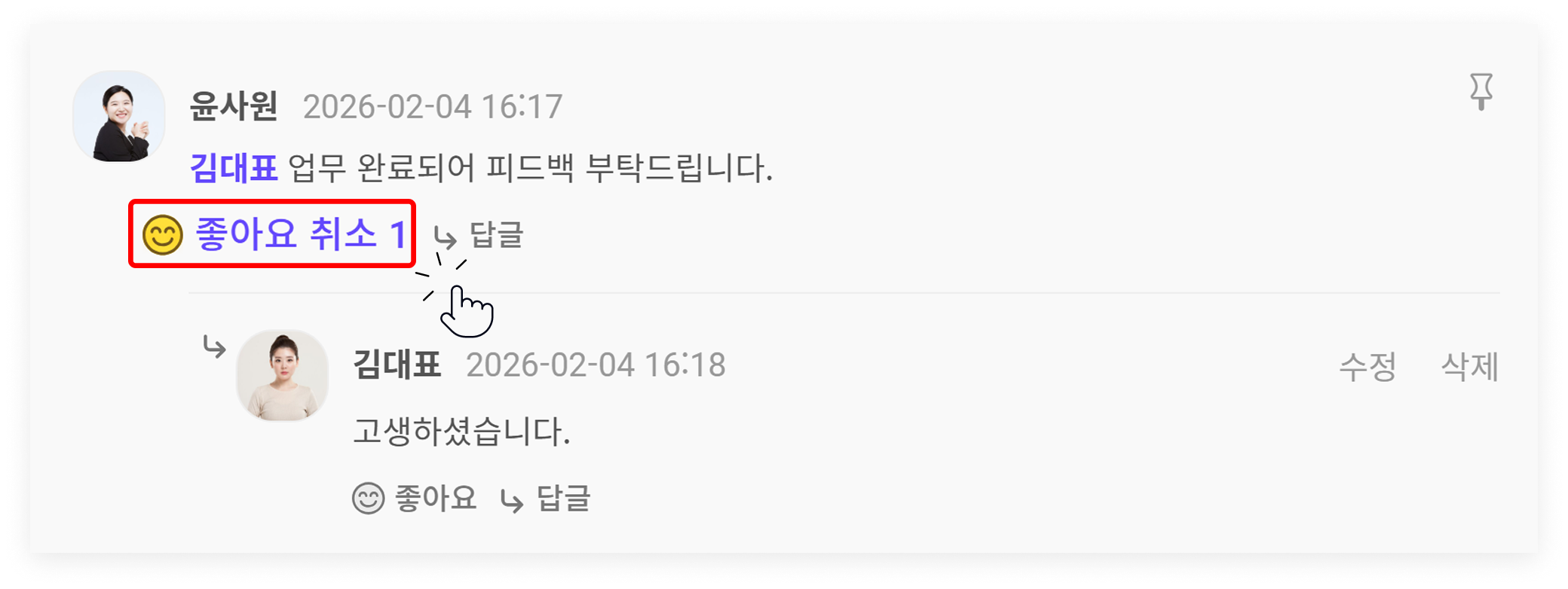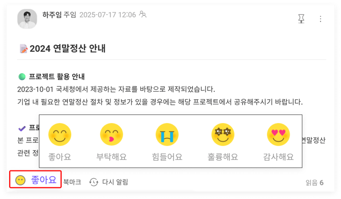 다른 사람이 등록한 게시물에 소통하는 2가지 방법이 있습니다! 게시물 내에서 간단히 소통함으로써 해당 글을 작성한 팀원에게 내용을 확인했음을 알려주거나 게시물과 관련한 소통을 이어나갈 수 있습니다.