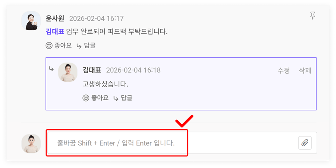 댓글을 통해 팀원이 작성한 게시물에 응답할 수 있습니다.