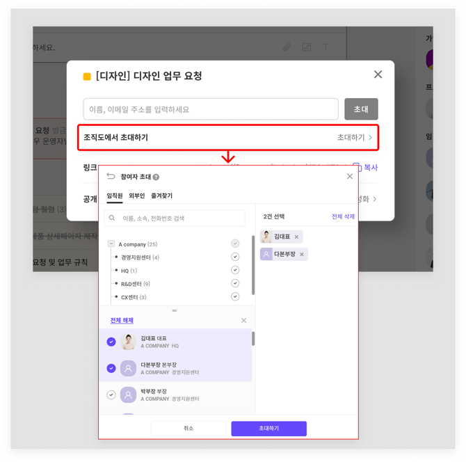 조직도를 설정한 경우, 프로젝트 참여자 초대 시에도 조직도 형태로 참여자가 조회되며 부서별로 인원을 초대할 수도 있습니다.
