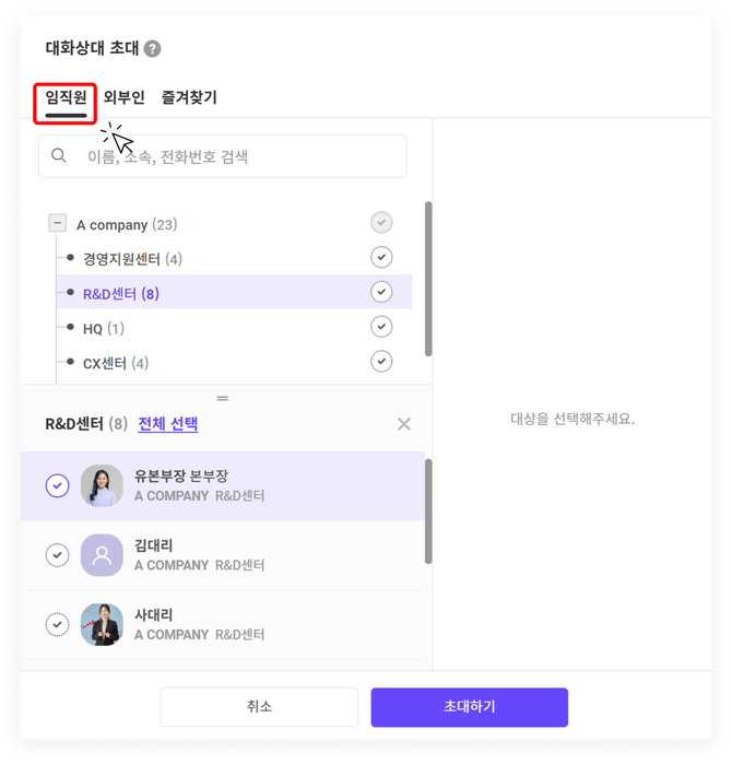 우리 회사의 직원으로 등록된 사용자를 검색하여 초대할 수 있습니다.
