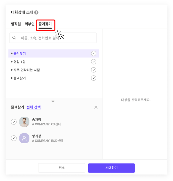 TIP. 자주 소통하는 사용자를 미리 즐겨찾기 그룹으로 설정해두면, 더욱 쉽게 프로젝트에 초대할 수 있습니다.