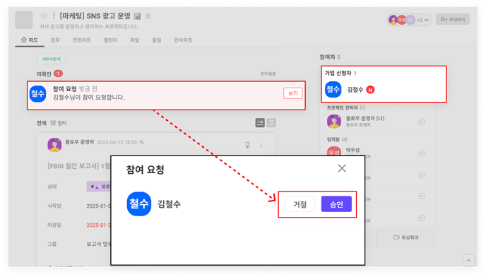 프로젝트 관리자는 프로젝트 참여 요청을 승인 or 거절하거나, 참여 중인 사람을 '내보내기' 또는 '프로젝트 관리자'로 추가 지정할 수 있습니다.