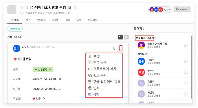 프로젝트 관리자는 다른 사람의 게시물을 '삭제'하는 것이 가능합니다.