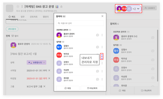 프로젝트 관리자는 프로젝트에 참여하고 있는 구성원 및 게시물을 관리할 수 있는 관리자입니다. 최초 관리자는 '프로젝트'를 생성한 사람으로 지정되며, 아래와 같은 기능들을 사용할 수 있습니다.