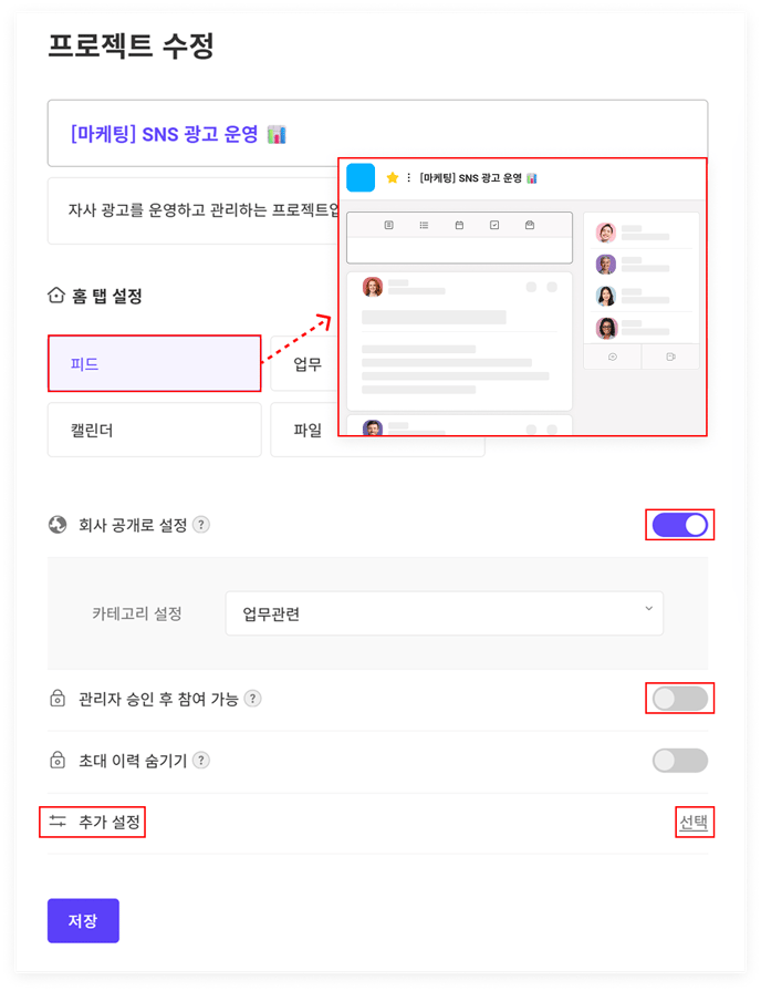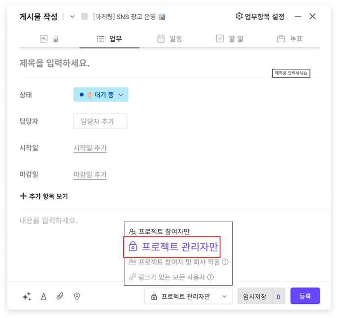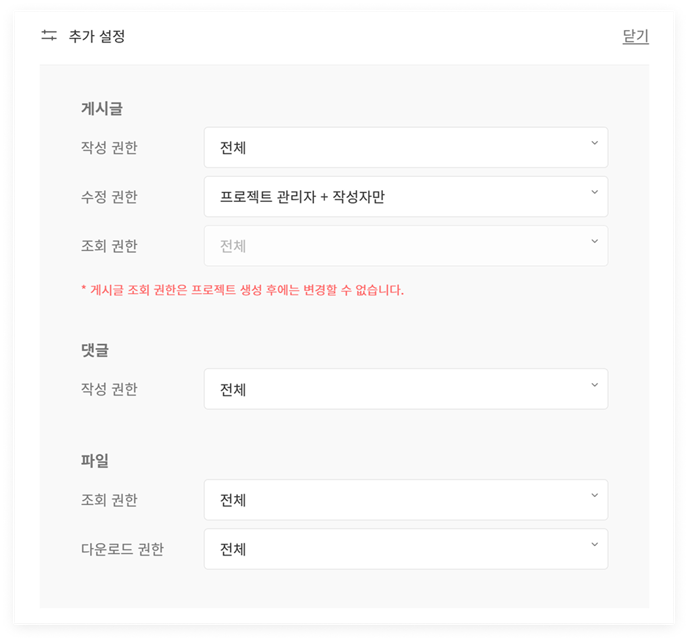 - 프로젝트 내 게시물 관련 상세 권한 설정도 가능합니다.