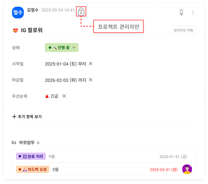 게시물 공개 설정이 '프로젝트 관리자만'으로 설정된 게시물을 확인할 수 있습니다.