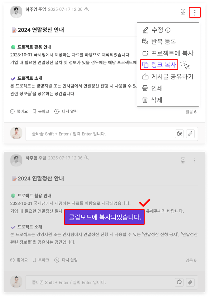 공유가 필요한 게시물 우측 상단에 있는 '더보기(점 세개)'를 눌러 '링크 복사'를 클릭합니다. 링크 복사가 완료되면 상단에 '클립보드에 복사되었습니다.' 라는 문구가 나타납니다.