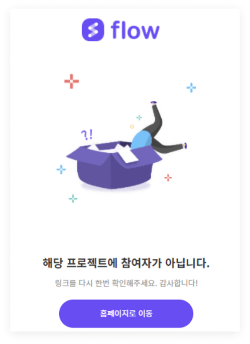 참여 중이지 않은 프로젝트의 링크를 전달 받았을 때는 '해당 프로젝트에 참여자가 아닙니다.'라는 페이지가 나타납니다. 내용을 확인하려면 해당 프로젝트에 초대받은 후 참여해야 합니다.