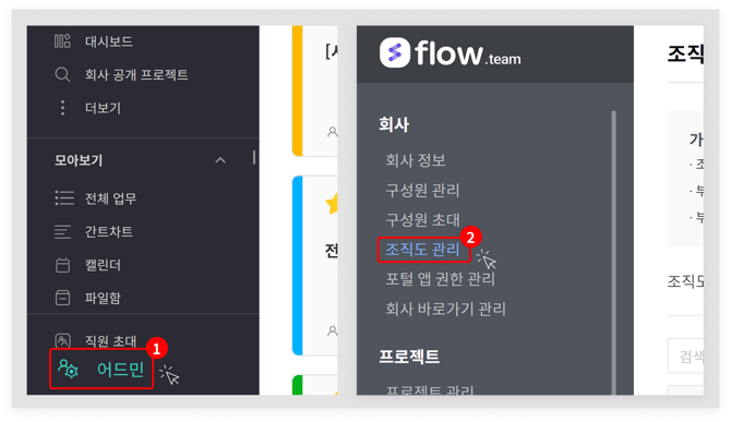 '어드민'은 우리 회사의 플로우 관리자에게만 보여지는 기능입니다. 플로우 관리자는 현재 관리자가 추가로 지정하거나 해제할 수 있습니다. (관리자 추가 지정 방법 바로가기)