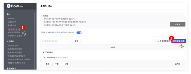 '조직도 관리 > 부서 일괄등록'을 선택합니다.