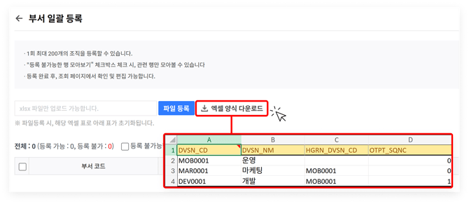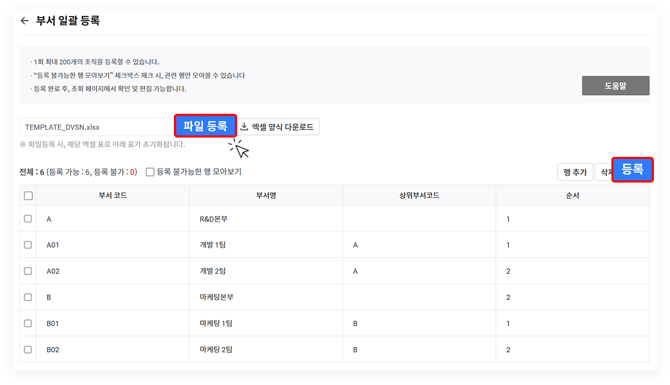 작성 후 저장한 엑셀 파일을 업로드한 뒤 등록된 부서코드, 부서명, 상위부서코드, 출력순서가 맞는 지 한 번 더 확인합니다. 확인 후 '등록' 버튼을 누릅니다.-png.png?width=670&height=386&name=Group%201410105913%20(1)-png.png)