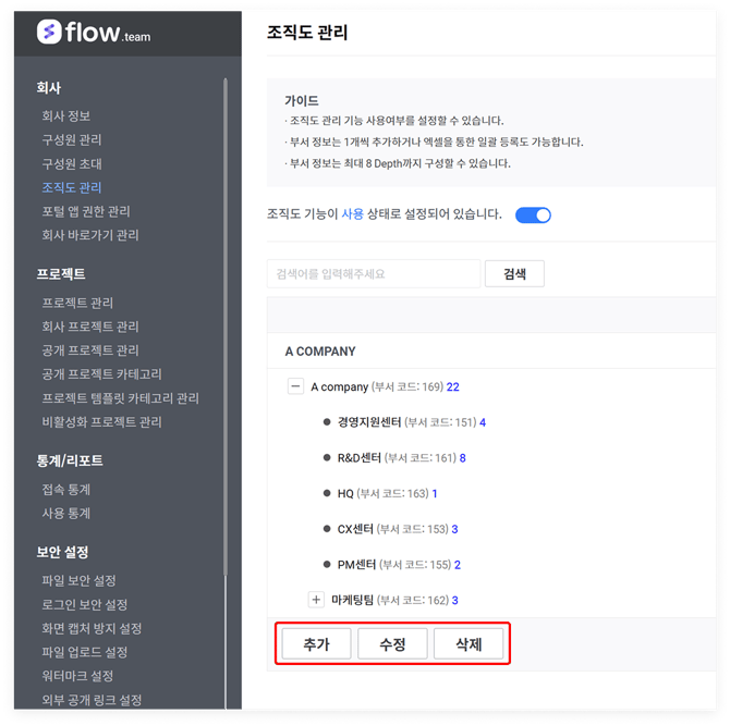 등록된 조직도 정보는 '조직도 관리'에서 확인할 수 있습니다. 입력한 정보에 맞게 등록이 되었는지 최종 확인합니다. 수정이 필요한 경우 '추가/수정/삭제'를 선택하여 변경할 수 있습니다.