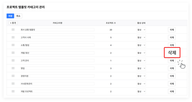 잘못 생성했거나, 더 이상 사용하지 않는 카테고리는 '삭제'를 클릭하여 완전히 삭제할 수 있습니다. 삭제하기 전 해당 카테고리에 저장되어 있는 템플릿들의 카테고리를 미리 변경해주거나 확인해주세요.