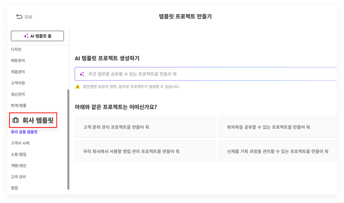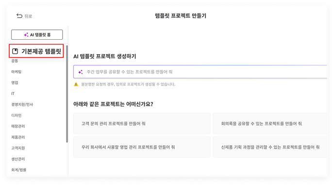'새 프로젝트' 버튼을 눌러 프로젝트를 만드는 상황에서 'AI 프로젝트 템플릿 생성' 메뉴를 통해 기본으로 제공되는 템플릿, 혹은 우리 회사에서 저장해 둔 템플릿 중 선택하여 프로젝트를 만들 수 있습니다.
