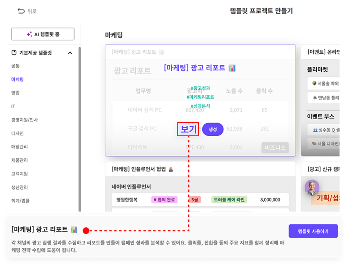 각 프로젝트 템플릿을 선택한 후 '보기'를 클릭하면 각 템플릿에 대한 설명을 확인할 수 있습니다. 어떤 템플릿인지 확인한 후, 업무에 맞는 템플릿을 선택하여 프로젝트를 만들어주세요.