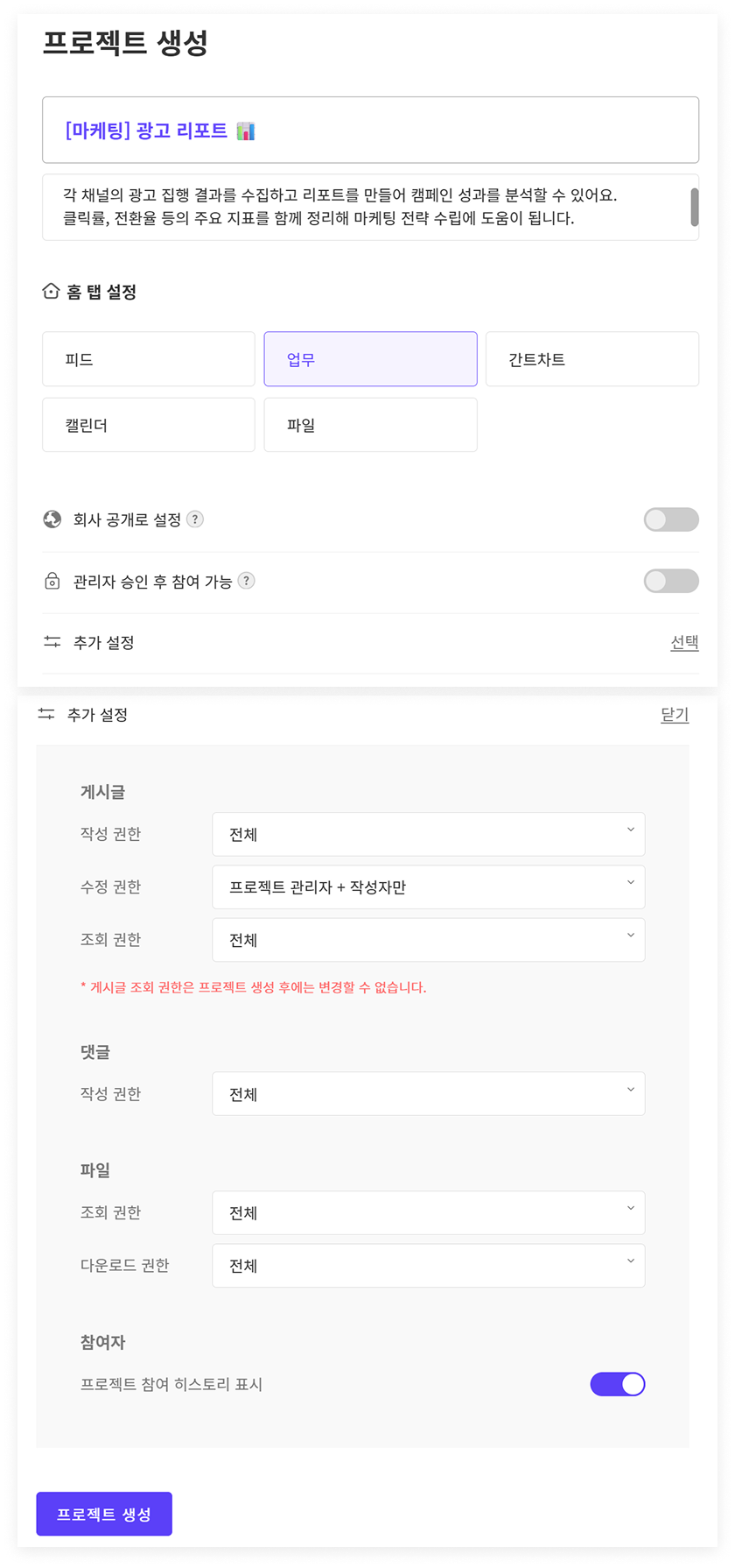 프로젝트 옵션은 업무 특성에 따라 권한 등이 미리 설정되어 있습니다. 권한 및 옵션도 우리 회사 특성에 맞춰서 활용해보세요.