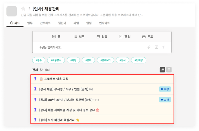 상단고정된 게시물은 프로젝트에 뒤늦게 참여한 사람도 바로 확인하여 업무를 시작할 수 있도록 도움을 줍니다. 프로젝트 소개, 이용 규칙 등 관련 중요한 내용은 상단고정으로 모두가 확인할 수 있도록 공유해주세요.
