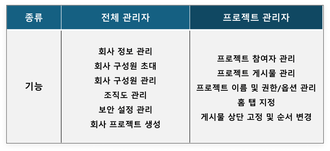 * 회사의 전체 관리자라도, 프로젝트에 참여 중이지 않다면 프로젝트 관리자의 권한은 별도로 부여되지 않는 점을 참고해 주세요.