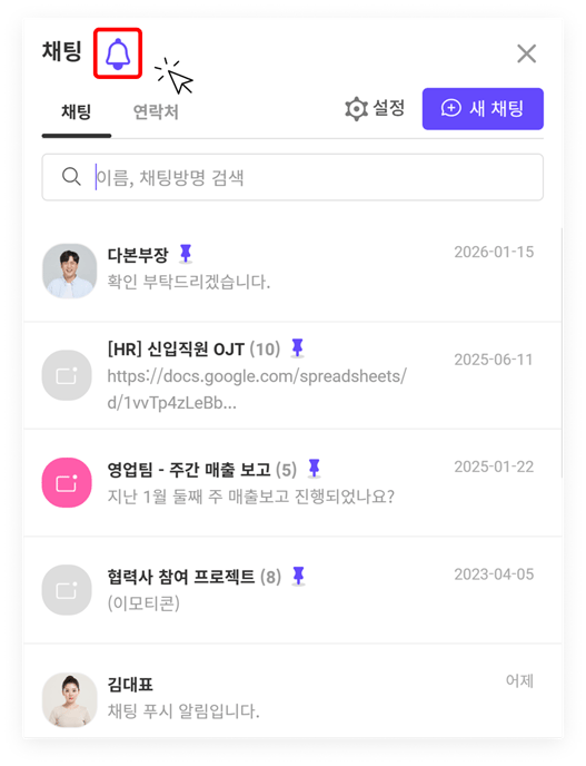 채팅 리스트 상단의 '종 모양 아이콘'을 클릭하여 알림을 ON/OFF 할 수 있습니다.