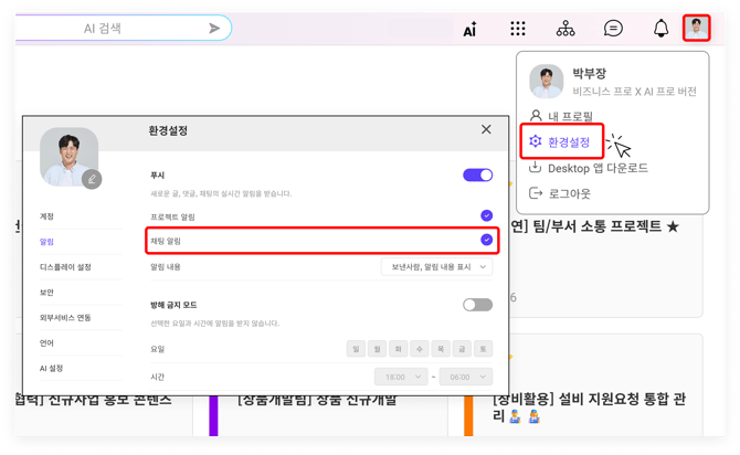 플로우 화면 우측 상단의 프로필을 누른 후, '환경설정 → 알림 설정'에 진입하여 '채팅 알림'을 ON/OFF할 수 있습니다.
