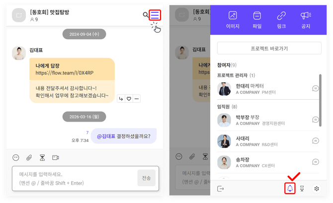 플로우 내 새로운 채팅 메시지 알림, 또는 채팅방별 알림을 설정할 수 있습니다. 중요하지 않은 채팅방 등은 알림을 비활성화하여 중요 채팅을 구분해보세요.