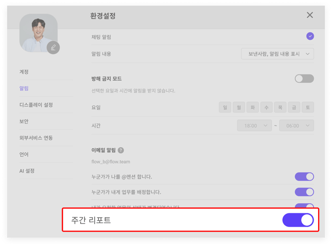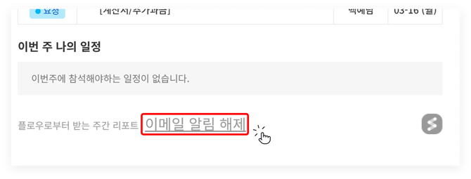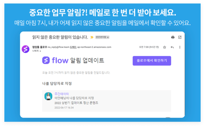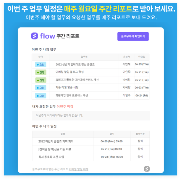플로우 안에서 아직 읽지 않은 중요한 알림, 이번 주까지 해야 하는 업무 리포트를 이메일로 받아볼 수 있습니다. 플로우 내부 알림은 물론, 이메일 알림으로 중요한 업무를 놓치지 않도록 이중 체크해보세요. 각 항목을 클릭하여 플로우로 바로 이동할 수도 있습니다.
