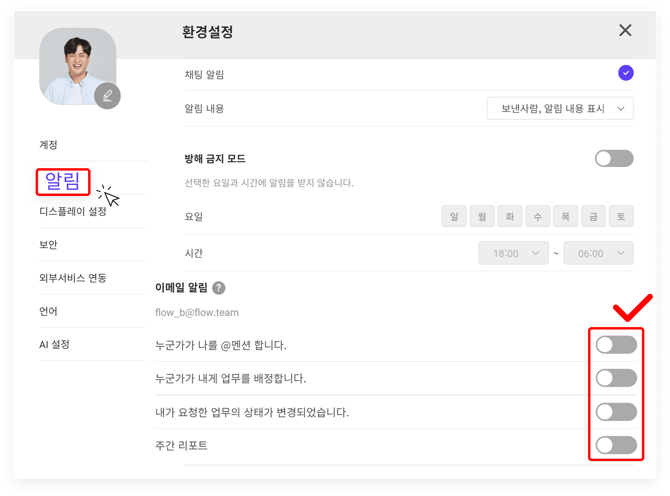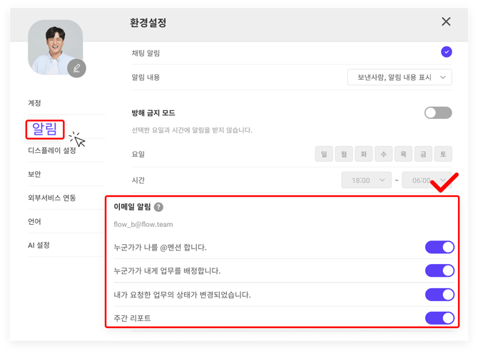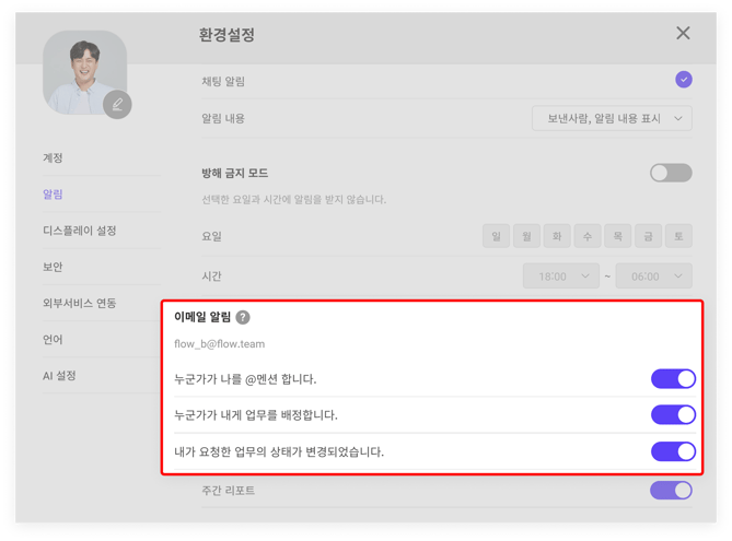 이메일 알림은 '환경설정 → 알림 → 이메일 알림' 부분에서 설정할 수 있습니다.