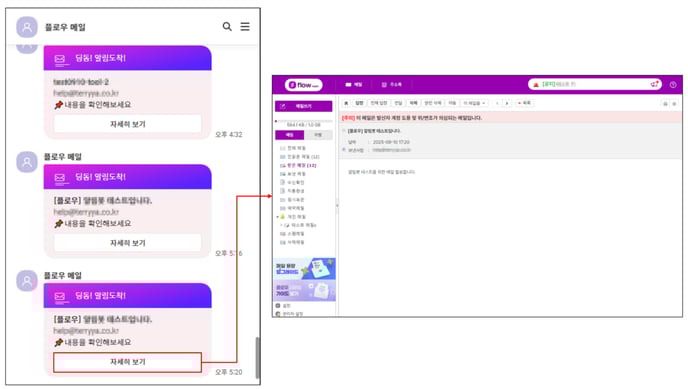 알림봇을 클릭하여 '자세히 보기' 버튼을 누르면, 플로우 메일 화면으로 바로 이동하여 수신 내용을 확인할 수 있게 됩니다.