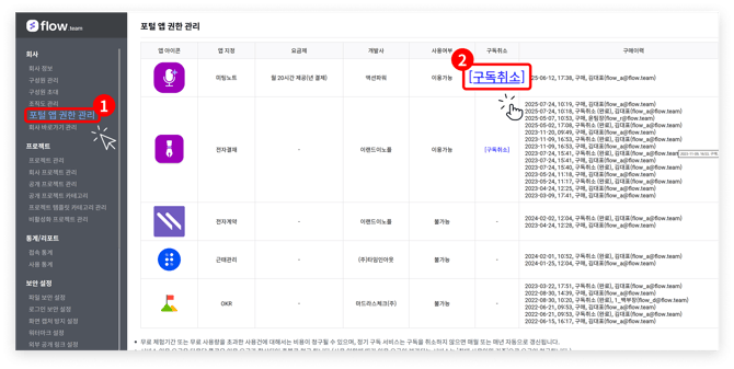 회사 내 관리자(어드민)라면, 전자결재와 근태관리 등 구독 중인 업무 포털 앱을 '어드민 → 업무포탈 앱 관리'에서 직접 구독 취소할 수 있습니다.