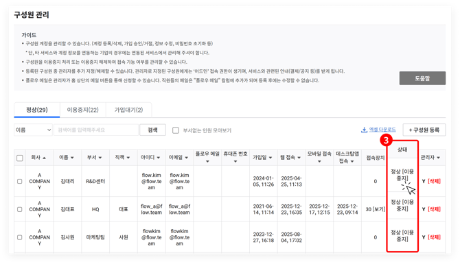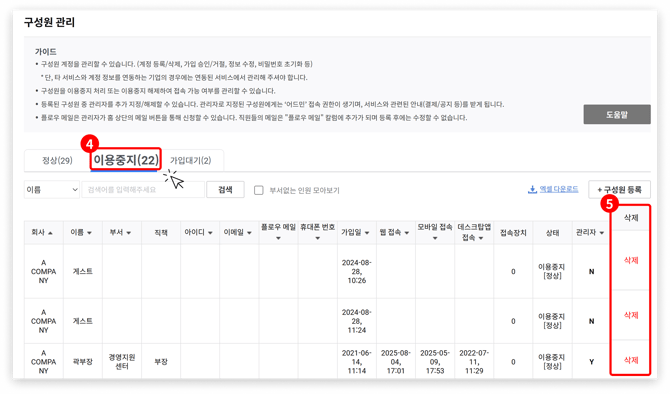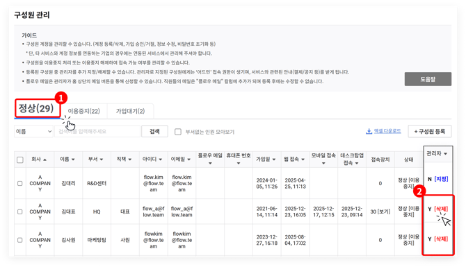 (1) 관리자 계정 사용자는 기업 내 다른 관리자에게 요청하여 '관리자 권한 해제' 이후 '이용 중지 → 탈퇴'를 진행해야 합니다. 자세한 절차는 아래의 이미지를 순차적으로 참고해 주세요.
