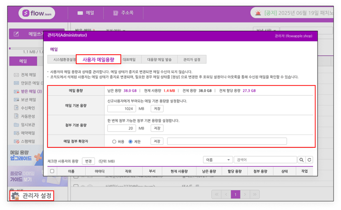 - 플로우 메일 용량 설정은 메일 화면 하단의 '관리자 설정 → 사용자 메일 용량 설정' 메뉴에서 가능합니다.