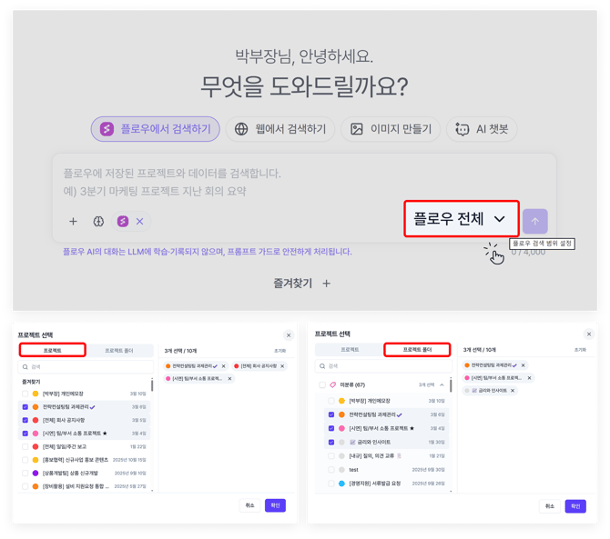 '플로우에서 검색하기' 모드가 설정되어 있는 대화창 아래의 '검색 범위 설정' 부분을 클릭하면, 현재 참여 중인 프로젝트 or 프로젝트 폴더로 구분해 둔 프로젝트들을 선택하여 해당 프로젝트 내에서만 검색될 수 있도록 범위 설정을 할 수 있습니다.