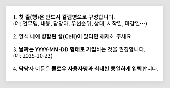 💡 정확한 변환을 위해서 가능하면 업무명과 상태 컬럼을 포함한 파일을 사용해 주세요.