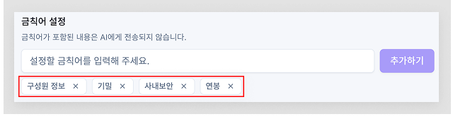 → 예시) “민감 정보에는 답변하지 않도록” 금칙어 설정(연봉, 주민등록번호 형태, 카드번호, 내부 코드명/시스템명, 인증키/토큰 등)