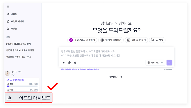 플로우 AI 화면에 진입한 이후(방법 자세히 보기), 왼쪽 하단의 '어드민 대시보드' 부분을 클릭하면 관리 화면이 실행됩니다.