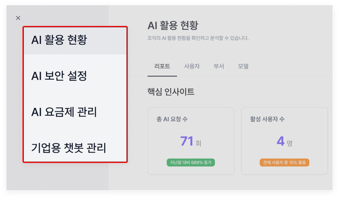 플로우 AI 화면에 진입하면 크게 4가지의 메뉴를 확인할 수 있습니다! 'AI 활용 현황', 'AI 보안 설정'을 비롯해 'AI 요금제 관리'와 '기업용 챗봇 관리'까지 진행할 수 있습니다. 구성원의 사용 현황을 살펴보는 한편, AI 이용 시 필요한 보안 요건을 전반적으로 체크해 볼 수 있어요.
